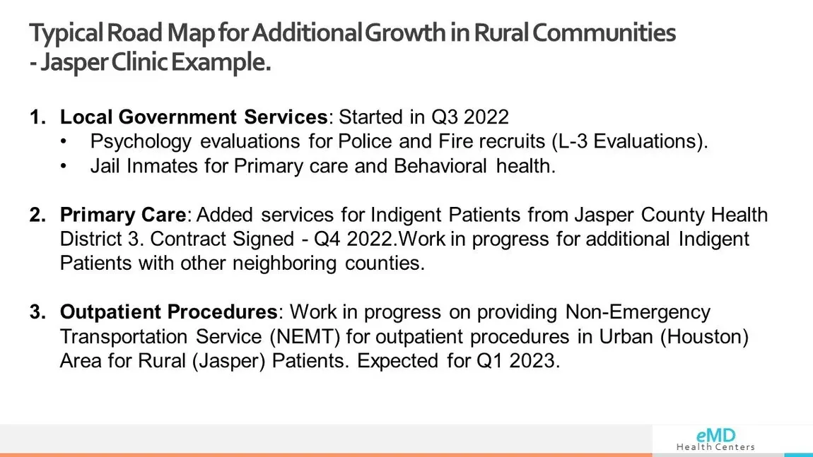 EMD Jasper Clinic in Texas has 2 Medical Assistants trained to use medical equipment to present patients to remote Physician. Allowing the remote physician to comprehensively examine the patients.